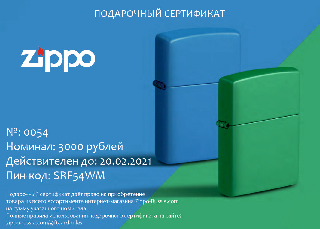Подарочный сертификат Zippo 7000 от официального дилера Zippo в Екатеринбурге. Вы можете дополнительно заказать гравировку, которая подчеркнет Вашу оригинальность и придаст памятность статусному подарку.